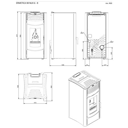 Poêle à pellets étanche Kalor 98 Redonda 6 Noir Conforme à la norme EN14785 - Ecodesign 2022 - Classe énergétique : A+ - Indice d'efficacité énergétique : 124 Puissance nominale : 6,4kW - Rendement : 94,5 % - Réservoir : 20 kg Dimensions (HXLXP) : 960x559x570 mm - Poids : 110 kg CO : 153 mg/Nm3 - OGC : 4 mg/Nm3 - NOx : 113 mg/Nm3 - Particules : 20 mg/Nm3 ETAS : 81 %